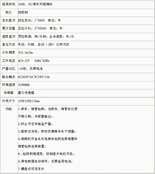 本記長儀廣泛應(yīng)用于紡織企業(yè)的186和2字開頭系列梳棉機(jī)記當(dāng)班產(chǎn)量用,可顯示4班產(chǎn)量。顯示羅拉轉(zhuǎn)速和出條速度,具有顯示直接,計(jì)量準(zhǔn)確。如需清花,細(xì)紗,粗紗型號(hào)記長儀請來電咨詢