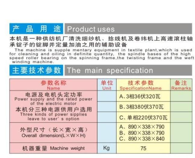 本機適用于棉紡、毛紡、化纖紡機高速滾柱軸承錠子清洗和定位加油,具有更加節(jié)能環(huán)保,省油的目的。該機采用雙齒輪泵,臟油可循環(huán)利用沖洗錠子,解決了錠子油浪費的問題.雙油槍構(gòu)造,雙過濾網(wǎng)、紫銅管連接,是B型加油機更新?lián)Q代產(chǎn)品,附帶漏電保護裝置,,更安全,更放心.壓力更高設(shè)有電路保護裝置 ~ 220V和380V兩種電壓可選!